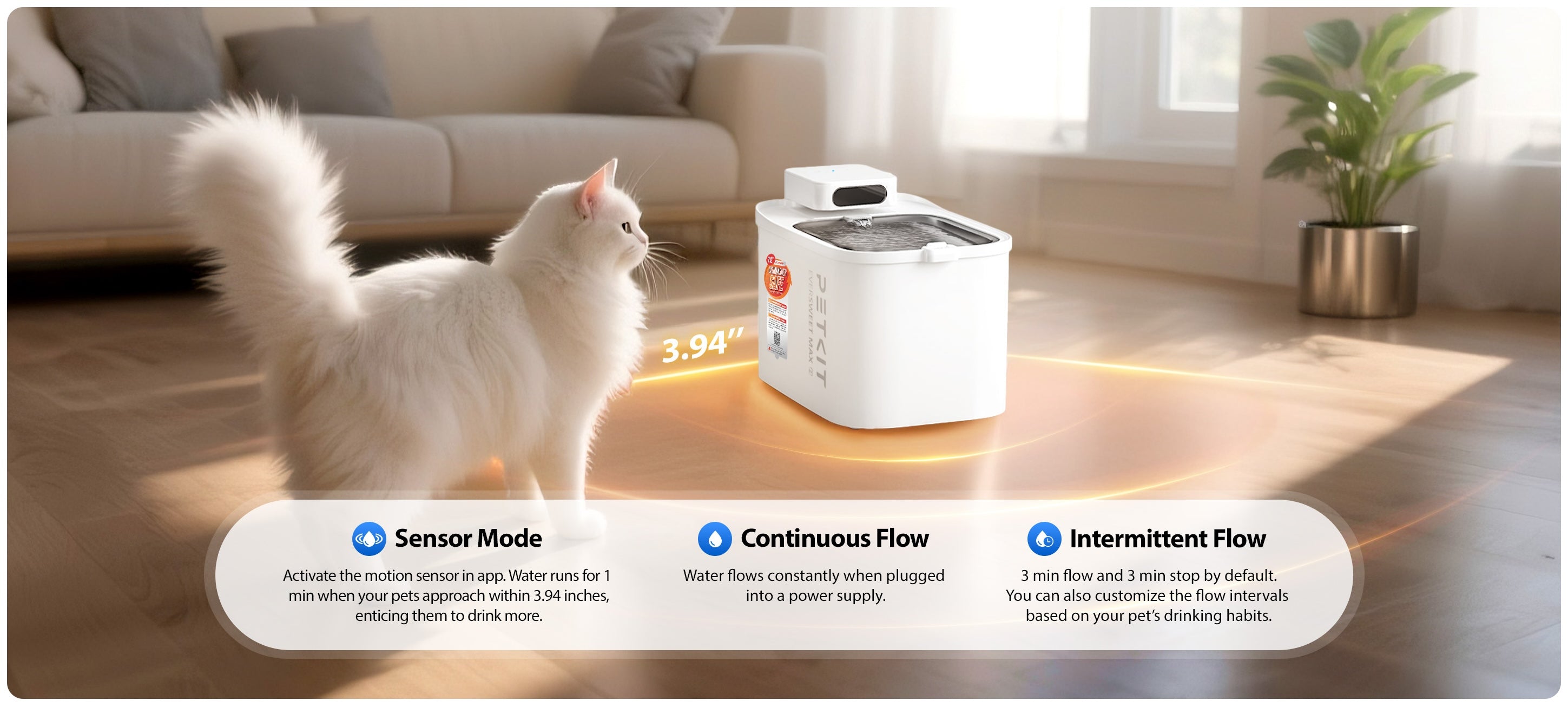 Interactive sensor mode encourages pets to drink more regularly, promoting better health.