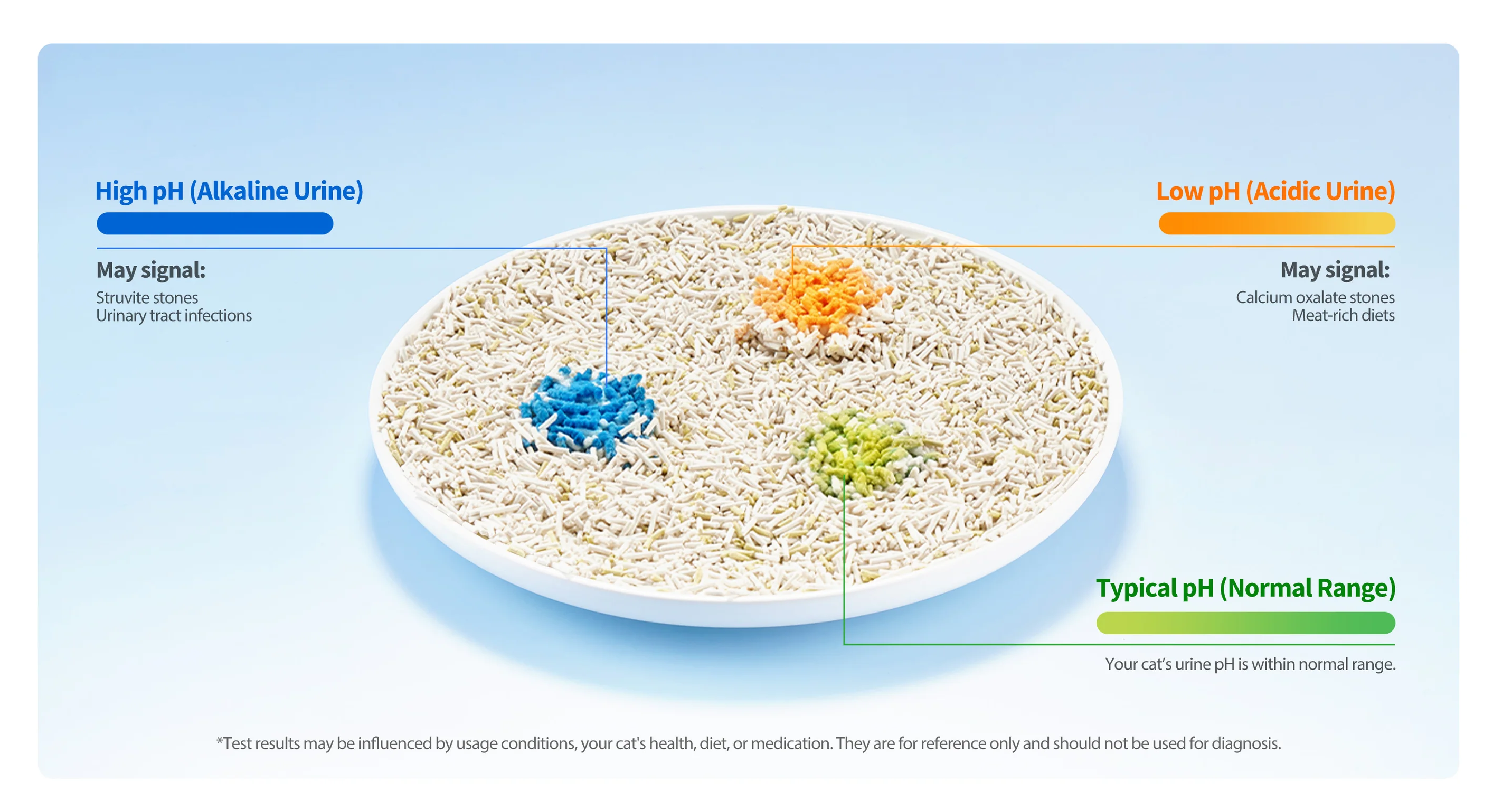 The pH-activated test particles change color within 3 seconds in contact with abnormal urine, signaling urinary irregularity like feline lower urinary tract disease (FLUTD).