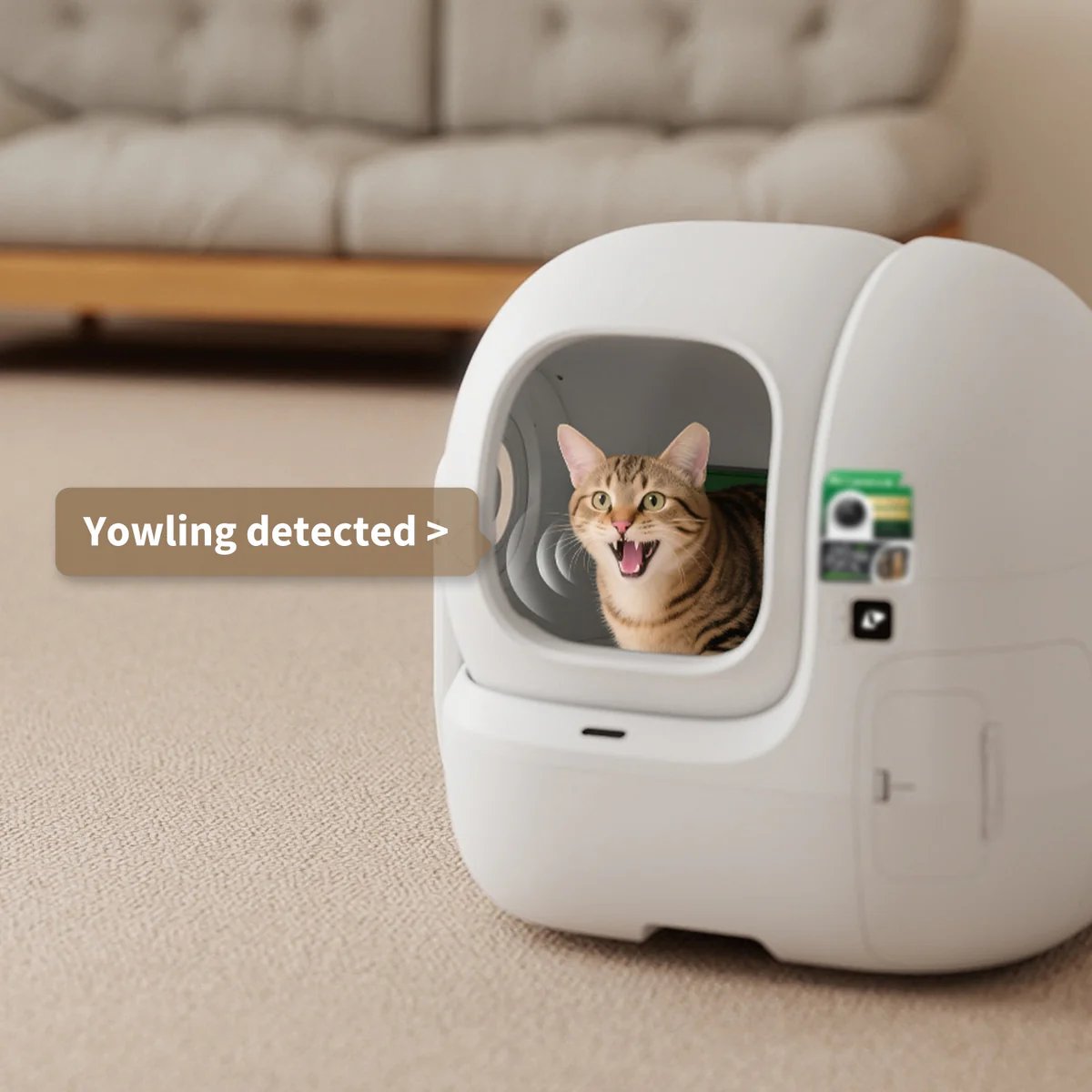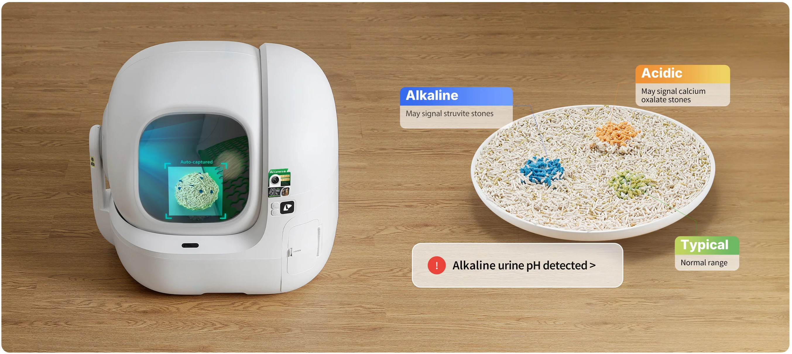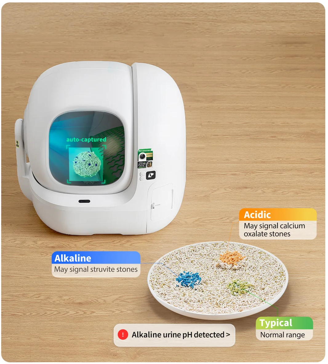 Each visit is captured by the AI camera, analyzing clumps to track urine pH. Instant app updates help spot potential urinary issues early, keeping cats healthy and giving owners peace of mind.