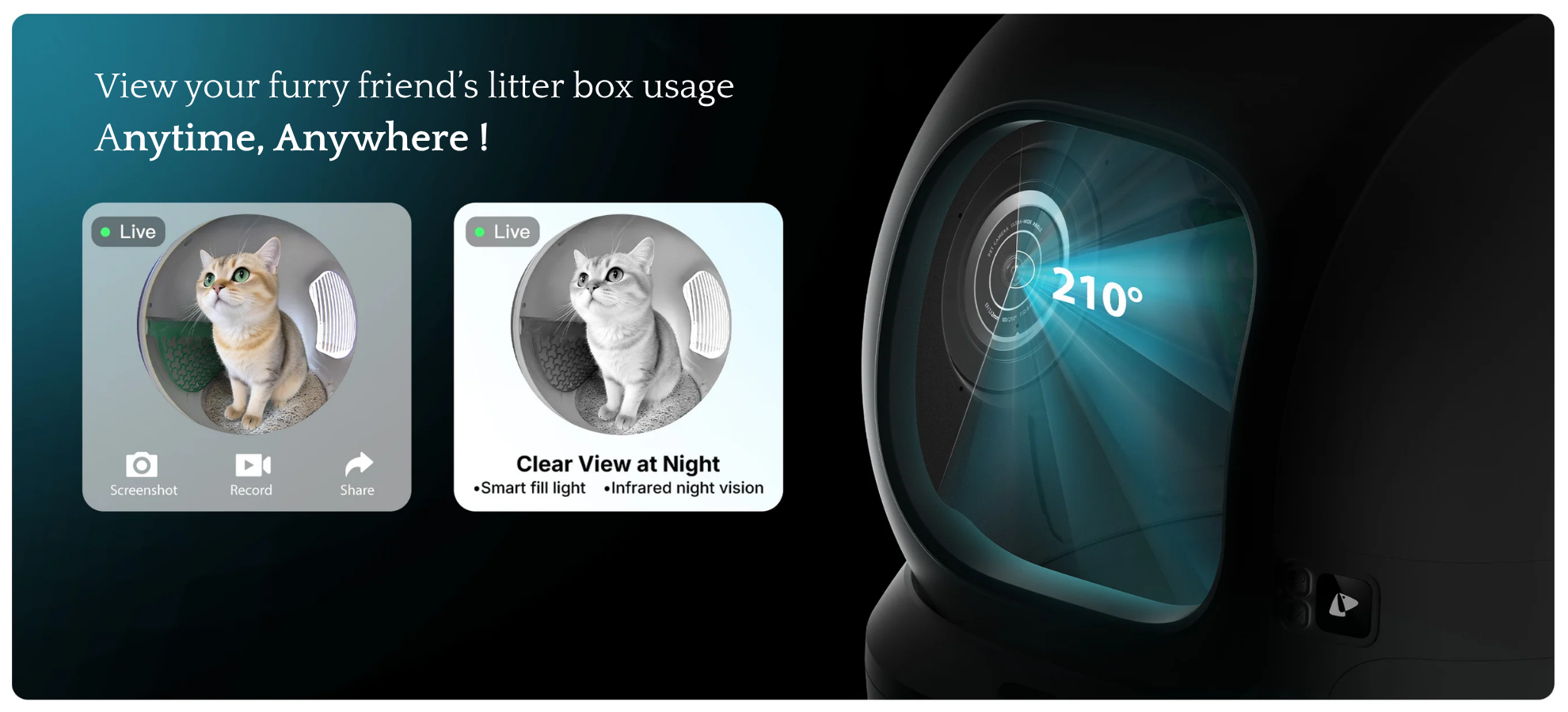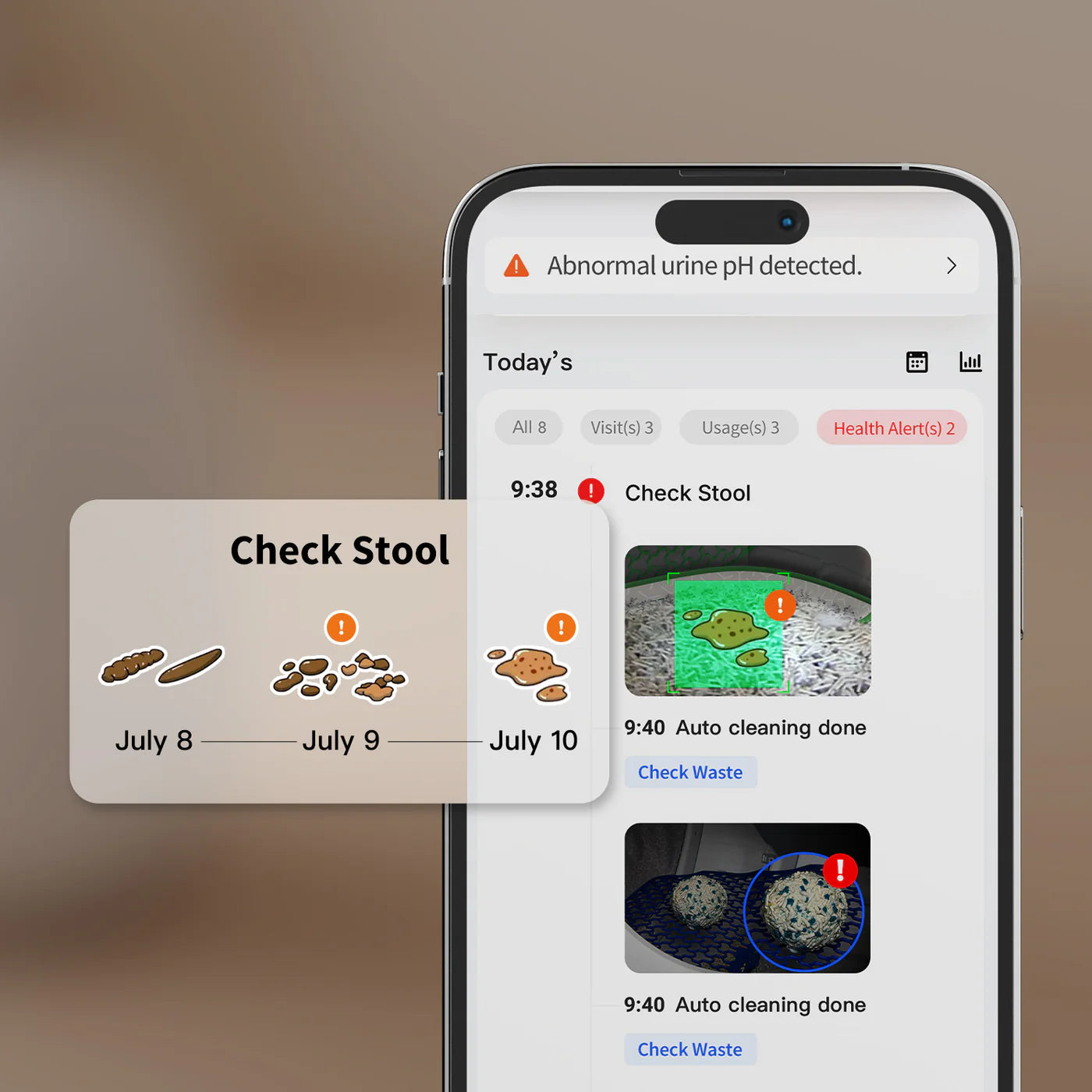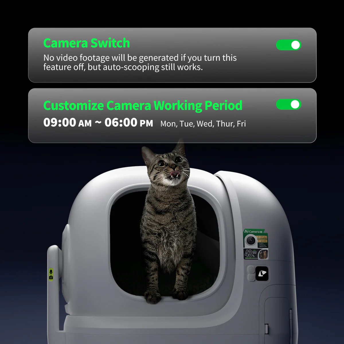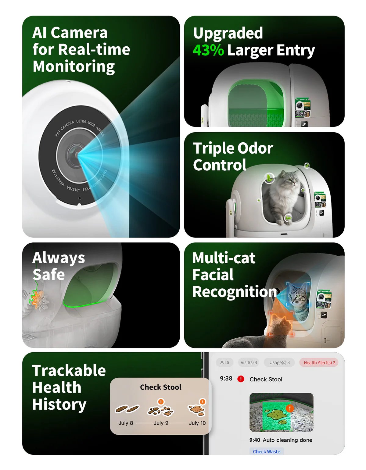 Each visit is captured by the AI camera, analyzing clumps to track urine pH. Instant app updates help spot potential urinary issues early, keeping cats healthy and giving owners peace of mind.