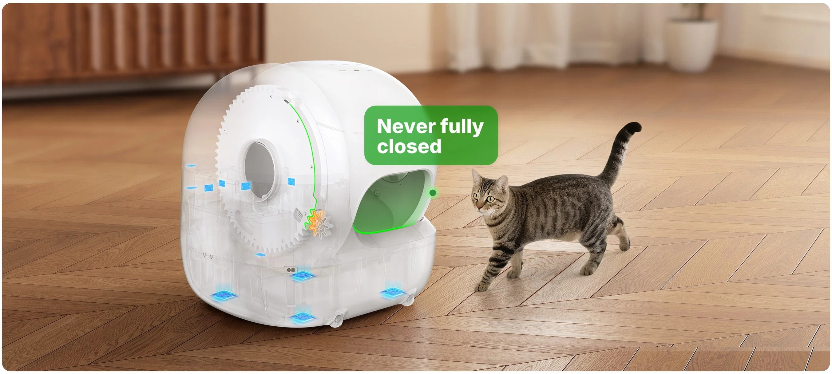 The patented anti-pinch design ensures the entrance is open at all times. 12 integrated safety sensors ensure maximum safety for cat’s every litter box visit.